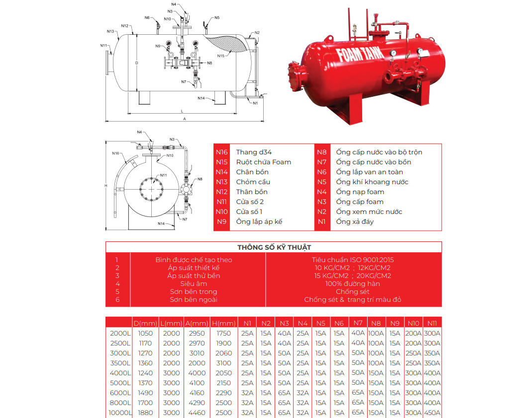 - Thiết kế và lựa chọn vật liệu gia công bồn chứa foam phù hợp với các yêu cầu của tiêu chuẩn ASME Code Section VIII dành cho bồn áp lực, đáp ứng chuẩn áp suất làm việc PN10 hoặc PN16.