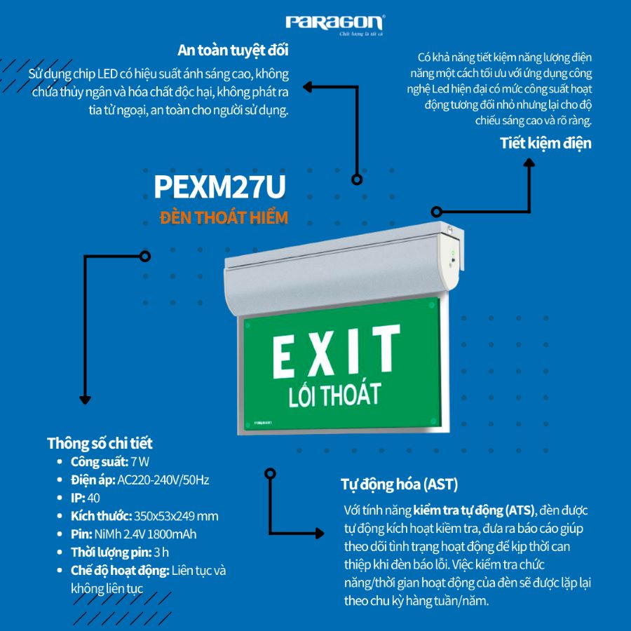Đèn Thoát Hiểm PEXM27U gồm 2 mặt thoát hiểm tùy chọn nhiều mặt tín hiệu thay thế để phù hợp với nhu cầu và vị trí lắp đặt trong các tòa nhà. Đèn thoát hiểm Paragon tích hợp chức năng ATS hiện đại giúp đèn hoạt động liên tục, ổn định và đảm bảo an toàn cho người sử dụng. Sản phẩm được Paragon bảo hành chính hãng trong 2 năm bao gồm pin.